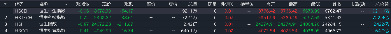 截至收盘,恒生指数跌0.87%,报24072.28点,国企指数跌0.96%,报8678.3点,恒生科技指数跌0.72%,报5302.82点。
