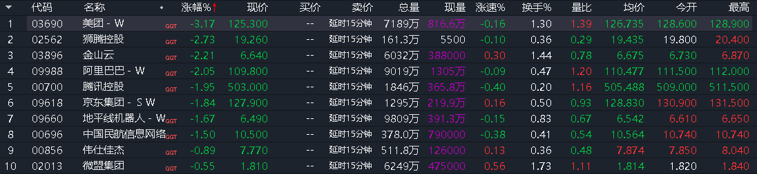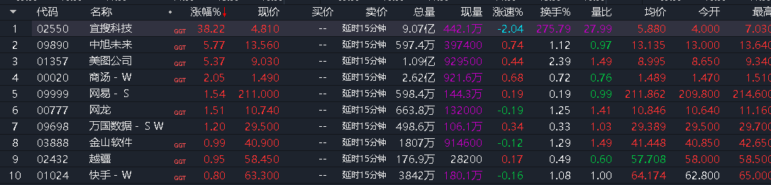 盘面上,科技股方面涨跌不一,宜搜科技大涨38.22%,中旭未来涨5.77%,美图公司涨5.37%,美团跌3.17%,狮腾控股跌2.73%,金山云跌2.21%。