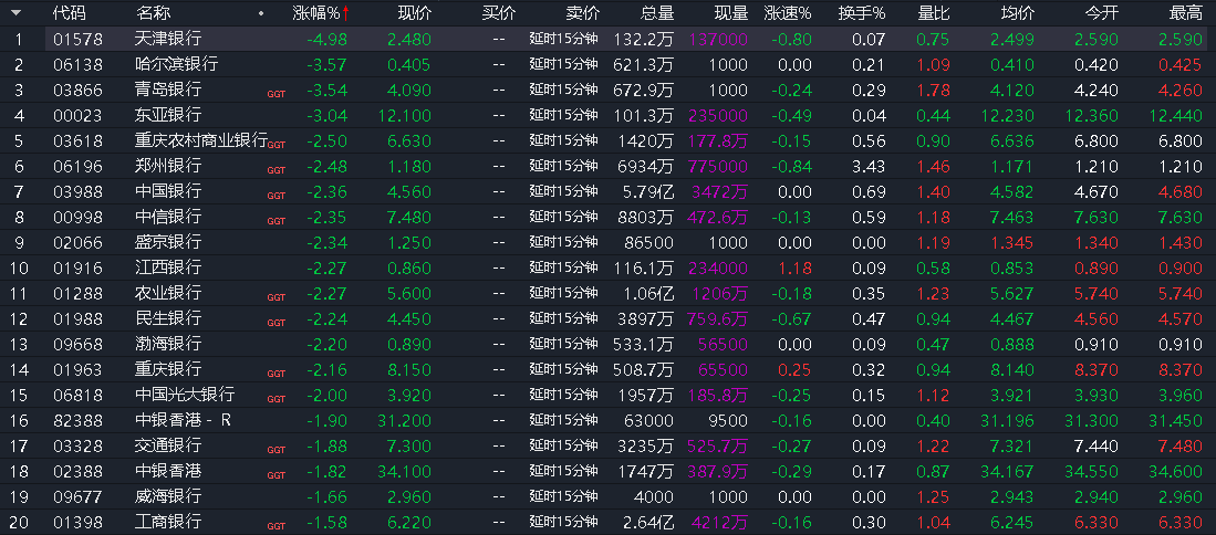 银行股表现低迷,集体下跌,天津银行下跌4.98%,哈尔滨银行下跌3.57%,青岛银行下跌3.54%。