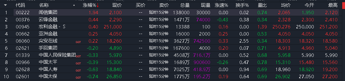 保险股表现低迷,众淼控股跌5.25%,新华保险跌2.29%,保诚跌2.20%