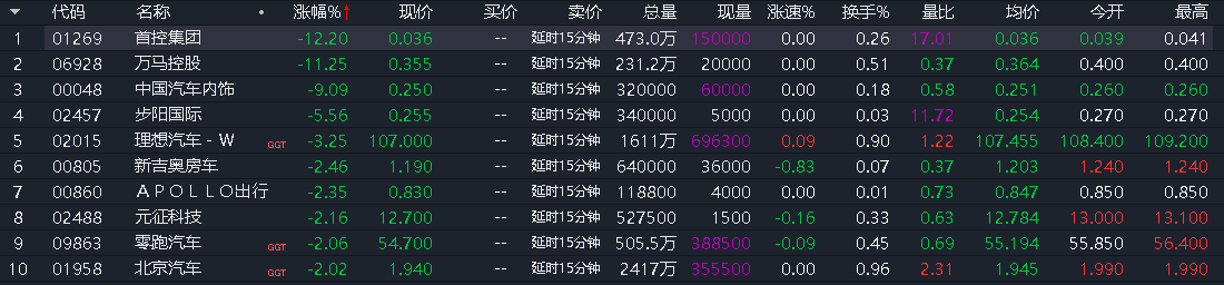 汽车股方面,多数下跌,首控集团跌12.20%,万马控股跌11.25%,中国汽车内饰跌9.09%,天瑞汽车内饰涨13.68%,双桦控股涨7.84%,德昌电机控股涨6.14%。