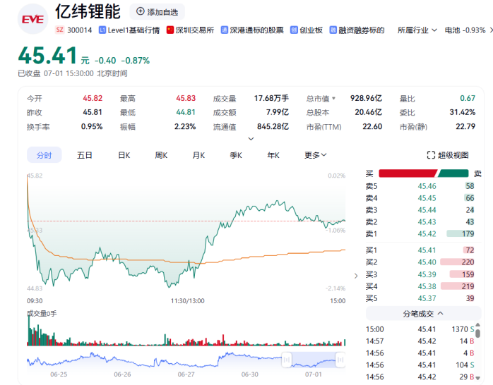 截至1日收盘,亿纬锂能市值929亿元(人民币,下同),收报45.41元,微跌0.87%。