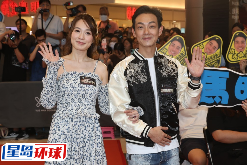 ▲日前马国明与老婆汤洛雯出席黄翠如和萧正楠儿子“萧哈哈”百日宴。蔡洁表示跟黄宗泽及马国明在《飞虎之雷霆极战》合作,她大赞两人工作很认真。