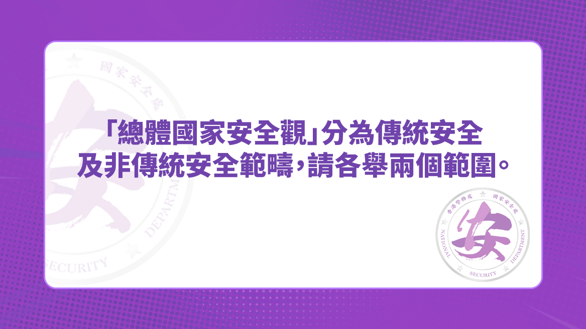 2. “总体国家安全观”分为传统安全及非传统安全范畴,请各举两个范围。A队最快举手回答,并答出正确答案。黎老师亦有为问题补充答案,其他问题两队都答得快而准,战况激烈,经双方切磋。最后两队打和,并由冯汉贤校长向学生送赠国安纪念品。