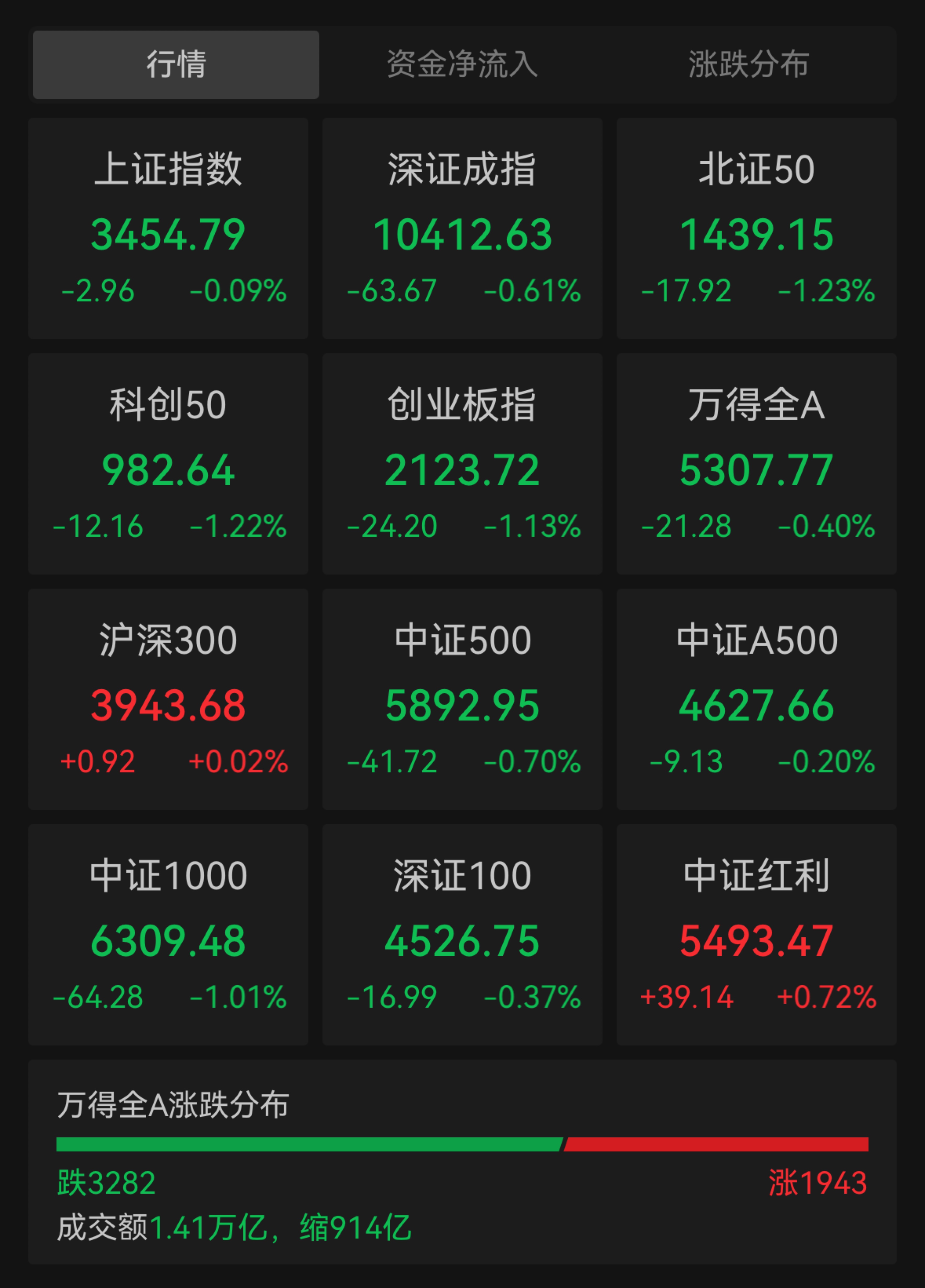 据新浪财经7月2日消息,A股三大指数今日集体下跌,截至收盘,上证指数微跌0.09%,深证成指跌0.61%,创业板指跌1.13%,北证50指数跌1.23%。全市场成交额14051亿元(人民币,下同),较上日缩量914亿元。全市场超3200只个股下跌。
