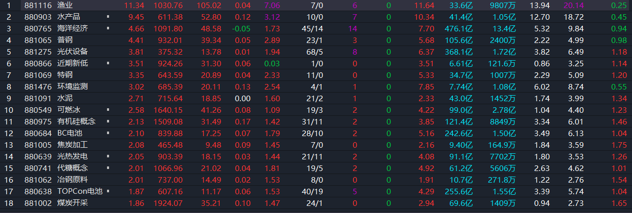 板块题材上,光伏、钢铁、养殖、代糖、煤炭、海工装备板块涨幅居前;算力硬件、半导体、军工装备、脑机接口、数字货币、多元金融板块跌幅居前。