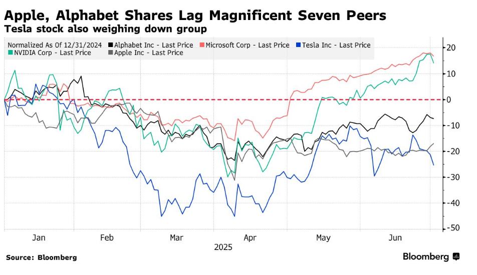 智通财经报道,近期投资者热议:若标普500指数中市值占比较高但股价轨迹萎靡的科技巨头们摆脱颓势,基准指数将获得多大提振空间?受关税阴云与AI业务推进阻力双重夹击,以3.2万亿美元市值位列标普500成分股第三的苹果公司(AAPL.US)年内累计下跌17%;互联网广告巨头谷歌母公司Alphabet(GOOGL.US)因市场担忧AI聊天机器人冲击其核心搜索业务,股价承压7%,当前市值维持在2.1万亿美元;电动汽车龙头特斯拉(TSLA.US)受需求端剧烈波动拖累,年内跌幅达26%。