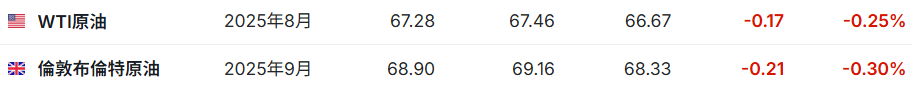 截至发稿,WTI原油跌0.25%,报67.28美元/桶。布伦特原油跌0.30%,报68.90美元/桶。
