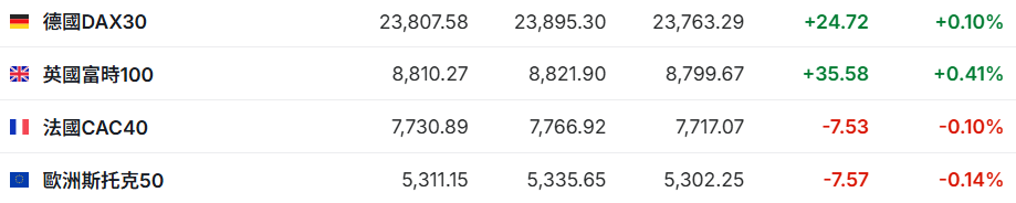 截至发稿,德国DAX指数涨0.10%,英国富时100指数涨0.41%,法国CAC40指数跌0.10%,欧洲斯托克50指数跌0.14%。