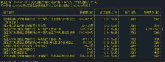 截至3月31日,众合科技十大流通股东累计持股1.4999亿股,占比22.22%。其中,有4家新进,分别是杭州城投产业发展投资合伙企业(有限合伙)、银万全盈56号私募证券投资基金、全盈2号私募证券投资基金、添橙橙子二号私募证券投资基金。