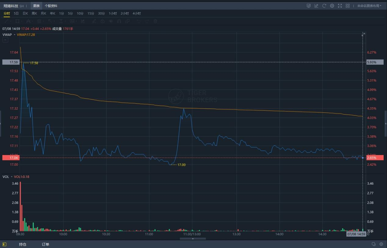 7月8日,上海翔港包装科技股份有限公司(以下简称:“翔港科技”,股票代码:603499.SH)发布业绩预增公告,预计2025上半年度净利润为7500万元到8500万元,同比增长410%到478%。今日股价高开低走,开盘报17.95元/股,涨幅8.13%,后迅速回落,涨幅收窄,截至当日下午收盘,报17.04元/股,涨幅为2.65%。