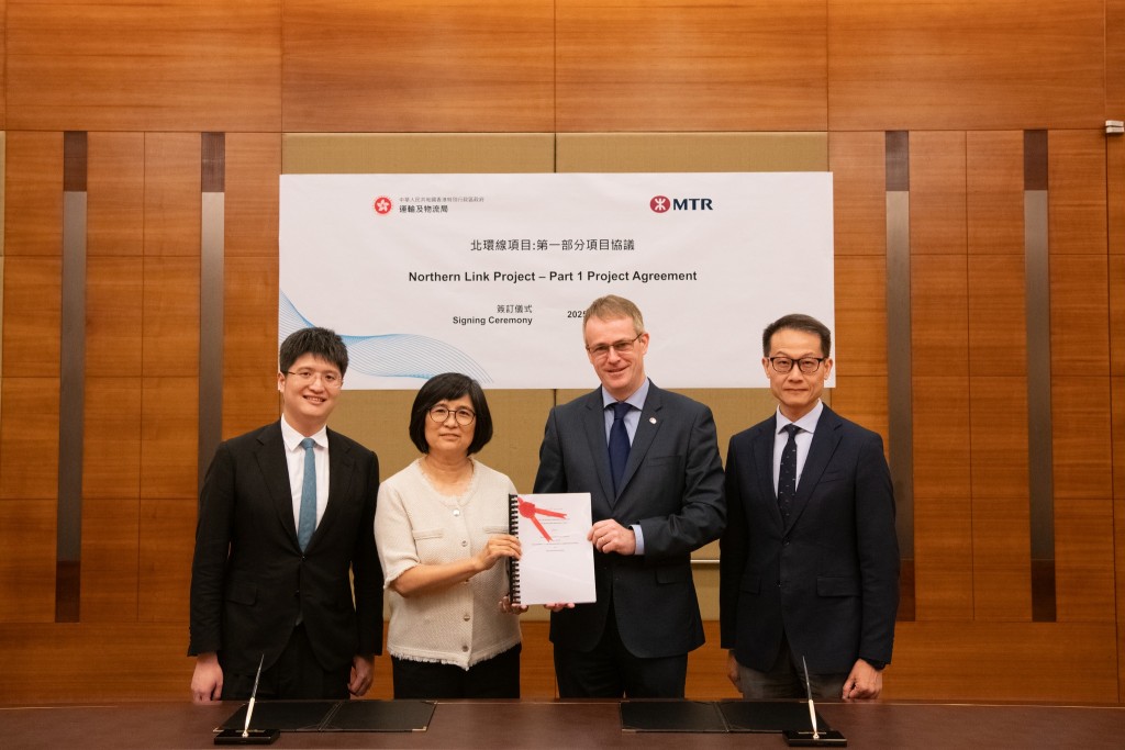 ▲运输及物流局副秘书长黄珮玟(左四)、路政署署长邱国鼎(右三)与香港铁路有限公司项目及工程拓展总监邓辉豪(右四)在签订第一部分项目协议后合照。路政署FB图片