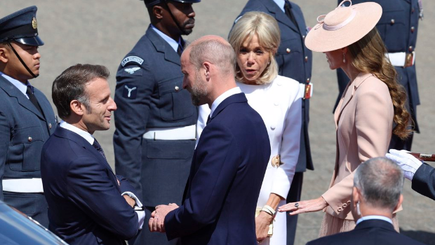 ▲2025年7月8日,法国总统马克龙与夫人布丽吉特抵达英国国防部北霍特皇家空军基地(RAF Northolt),展开为期三天的国是访问,受到英国威廉王子与威尔斯王妃凯特迎接。(图/美联社)