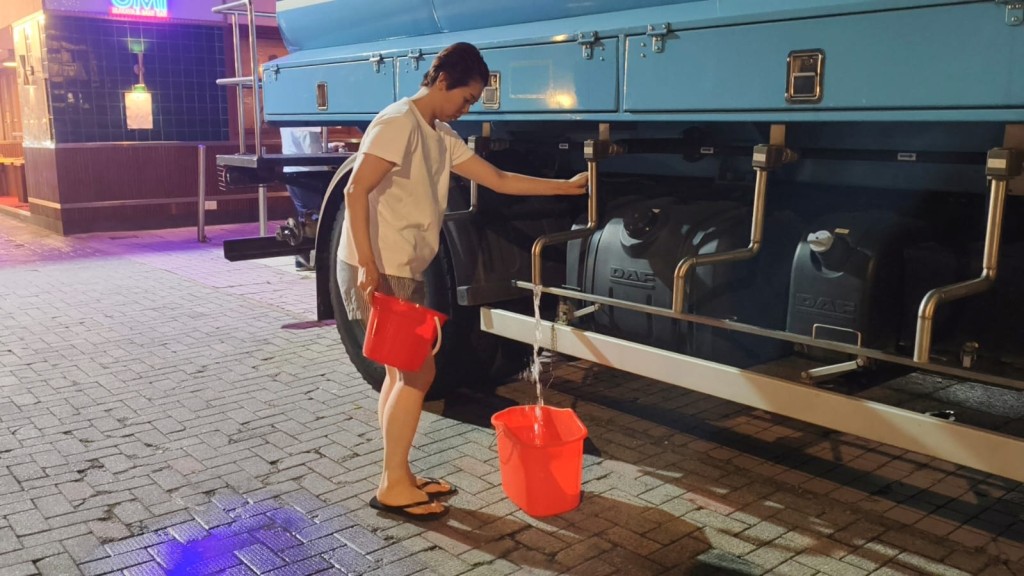 西湾河嘉亨湾有居民反映食水出现不明黑点,水务署经化验后初步证实为沥青,已派员协助屋苑管理处清洗水缸,并在供应嘉亨湾的公共水管入水位加装过滤设施。《星岛头条》今日(9日)晚上到场视察,见到工人进行工程,为食水管加装滤网,同时亦发现水务署一辆水车停在鲤景湾海旁行人路,为有需要市民提供食水,其间有女住户到水车取水。