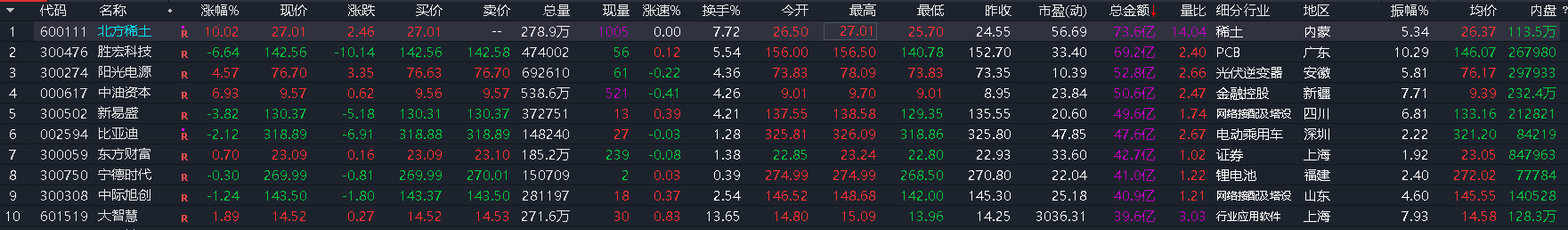 ▲10日,北方稀土半日成交73.6亿元,列A股成交额榜首。