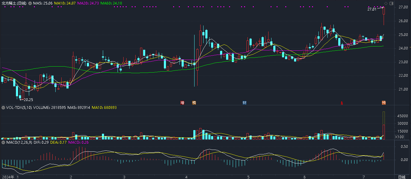 7月10日,稀土龙头企业北方稀土(600111.SH)高开高走,10:51首度触及涨停后打开,经过15分钟多空交手,于11:06被强大买盘再次推至涨停板27.01元直至午市收盘,股价创年内新高,市值达976.43亿元,半日成交73.6亿元,列A股成交额榜首。