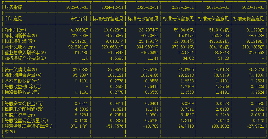 2024年,受全球经济增长乏力及下游需求增长不及预期等市场供求关系因素影响,北方稀土财务数据显著下滑。全年实现营业总收入329.66亿元,同比下降1.58%;归属净利润10.04亿元,同比大幅下降57.64%;扣非净利润9.01亿元,同比下降61.12%;2025年第一季度营收92.87亿元,归母净利润4.31亿元,资产负债率37.69%。