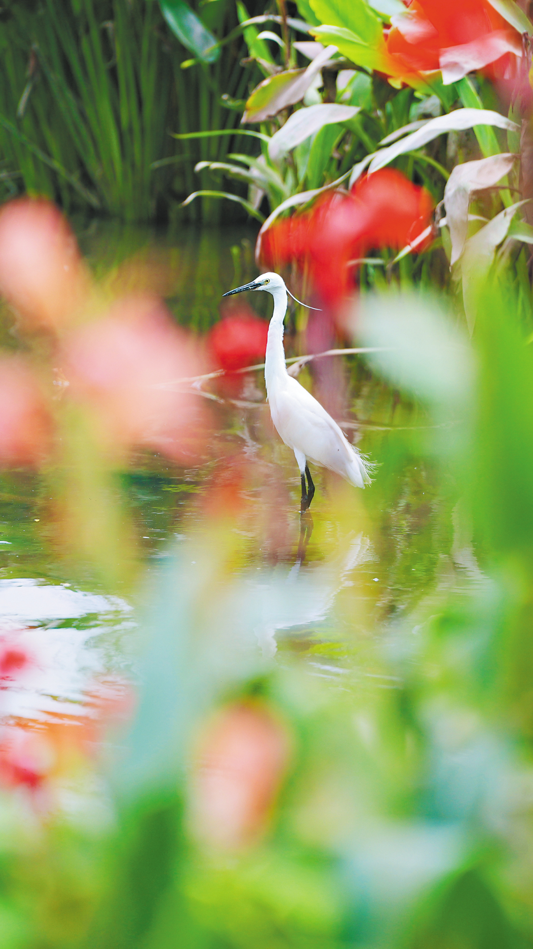 ▲河涌水质清透,吸引白鹭嬉戏觅食。