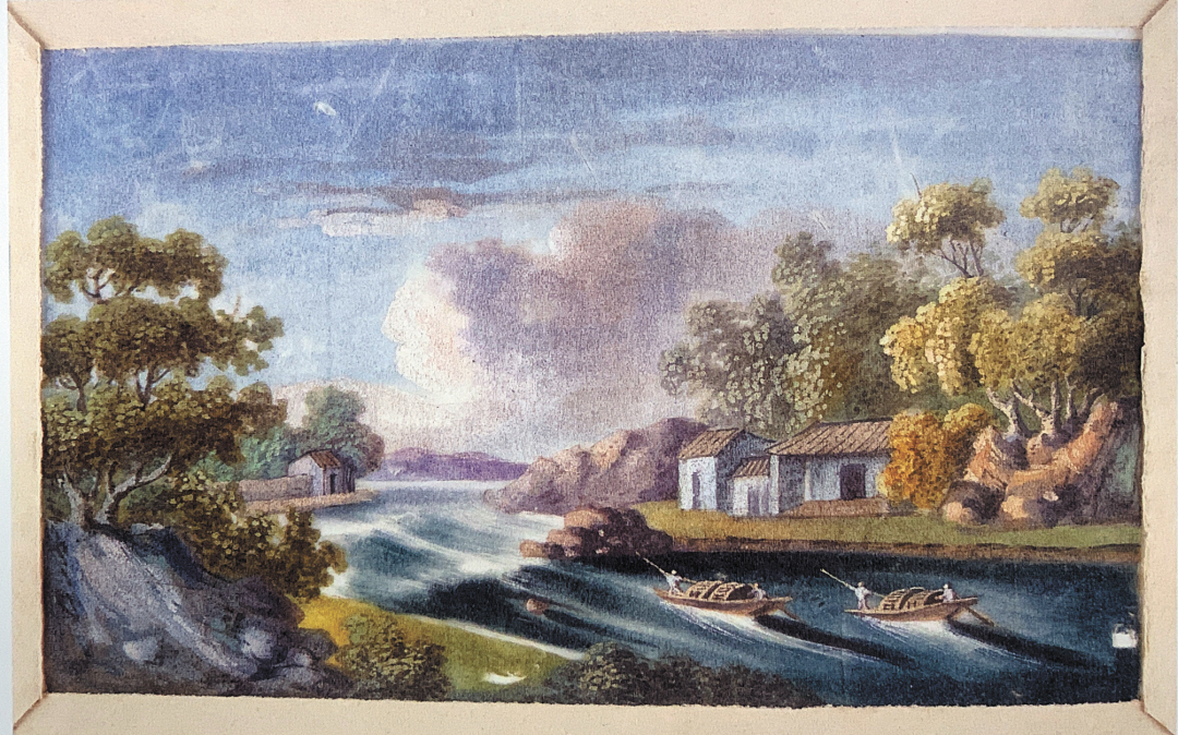▲水乡风光图(清代广州外销通草水彩画)