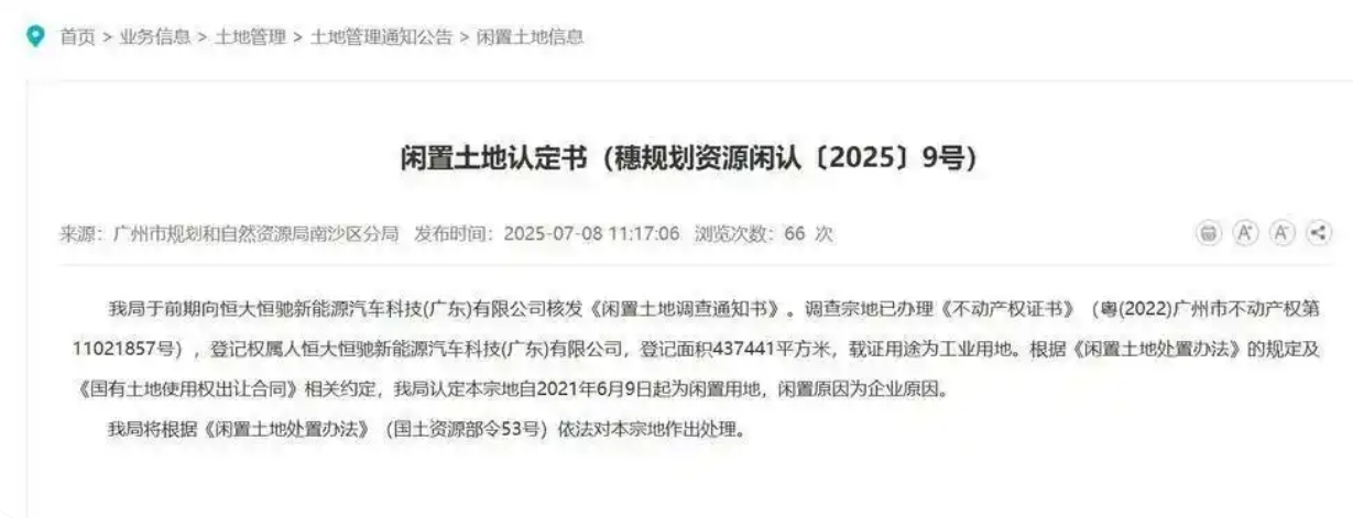 广州市规划和自然资源局南沙区分局公示一则《闲置土地认定书》(穗规划资源闲认〔2025〕9号),认定恒大恒驰新能源汽车科技(广东)有限公司为权属人的一宗地块自2021年6月9日起为闲置用地,闲置原因为企业原因。