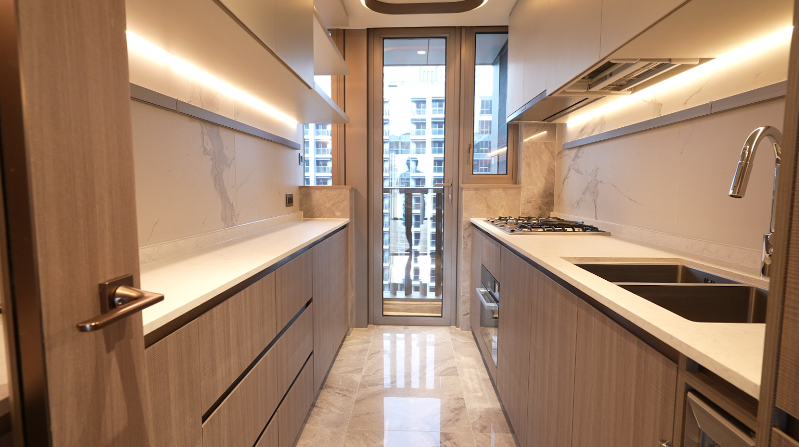 厨房属于梗厨设计,收纳空间充裕,厨柜特设双层式伸缩设计的收纳层架,善用厨房每一吋空间。同时配备德国Miele嵌入式雪柜、蒸焗炉、电磁炉、单头及双头煤气炉,另外更有德国西门子洗衣干衣机及Vinvautz酒柜等。