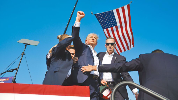 ▲特朗普2024年7月13日在宾州巴特勒郡(Butler County)出席竞选活动时遇刺,现场传出多声枪声,多名特勤人员冲上台掩护特朗普,特朗普右耳受伤、脸部染血,仍一路振臂挥拳喊口号。(美联社)