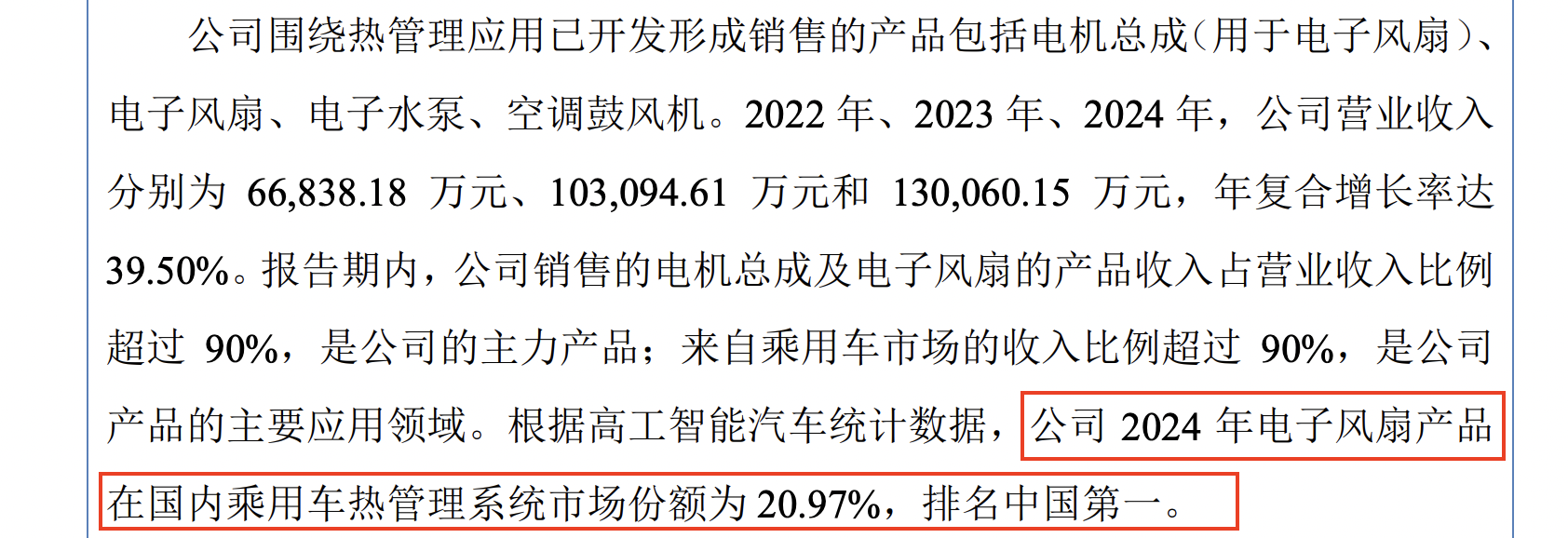 报告期内,朗信电气销售的电机总成及电子风扇的产品收入占营业收入比例超过90%,是公司的主力产品;来自乘用车市场的收入比例超过90%,是公司产品的主要应用领域。根据高工智能汽车统计数据,公司2024年电子风扇产品在国内乘用车热管理系统市场份额为20.97%,排名国内第一。