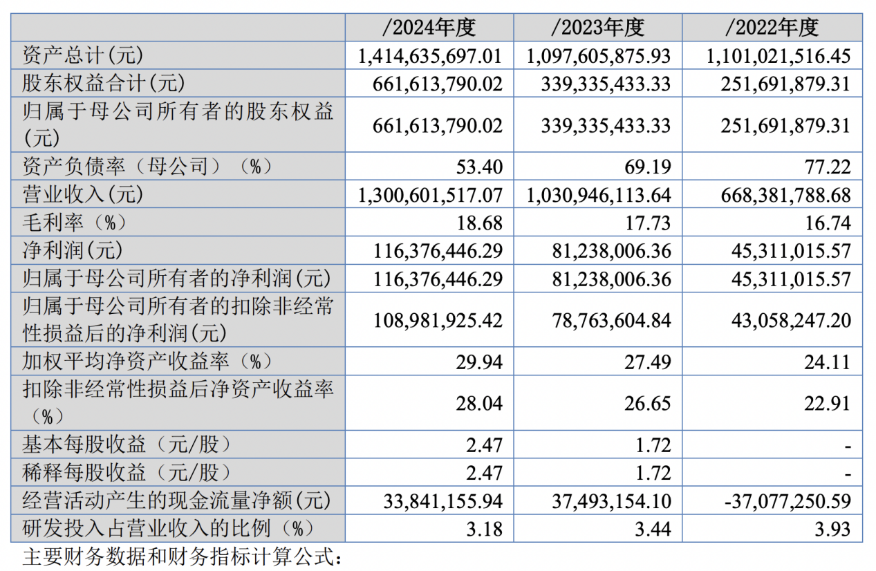 2022年至2024年,朗信电气营业收入分别为6.68亿元、10.31亿元和13.01亿元,净利润4531.10万元、8123.80万元和1.16亿元,毛利率分别为16.74%、17.73%和18.68%。