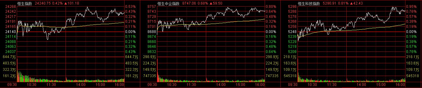 7月14日消息,港股三大指数集体收涨。截至收盘,恒生指数(24240.75, 101.18, 0.42%)涨0.26%,报24203.32点,恒生科技指数(5290.91, 42.43, 0.81%)涨0.67%,国企指数涨0.52%。