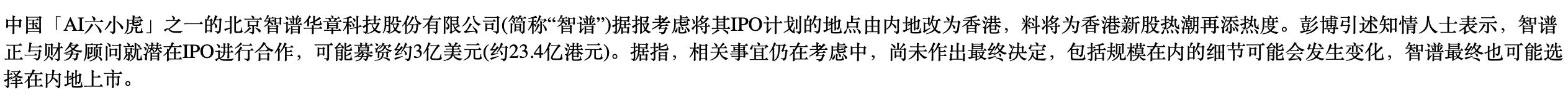 近日,据彭博消息,北京智谱华章科技股份有限公司(以下简称“智谱”)正考虑将IPO地点转移至香港,可能寻求融资约3亿美元。