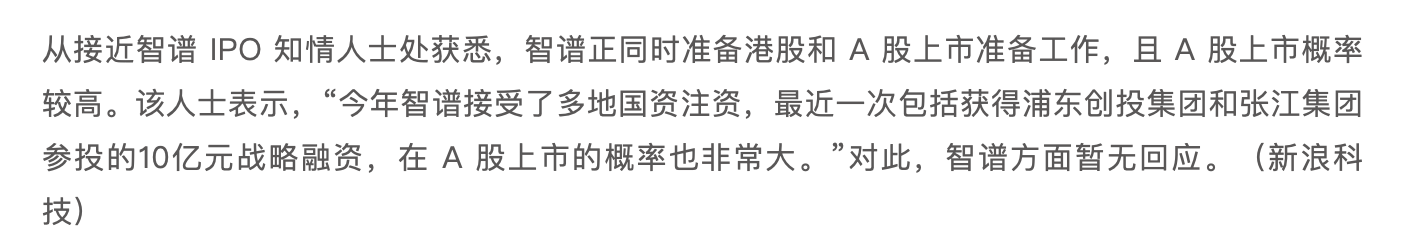 而据新浪报道,智谱正同时准备港股和A股上市准备工作,且A股上市概率较高。