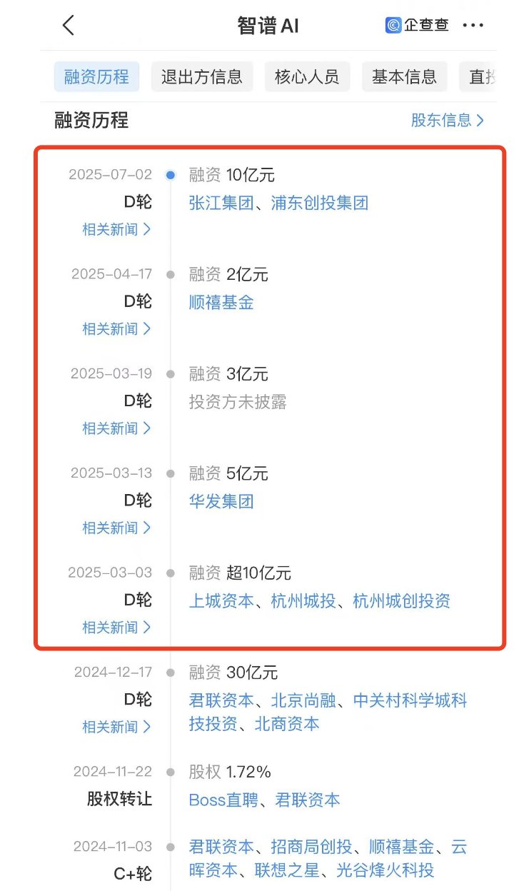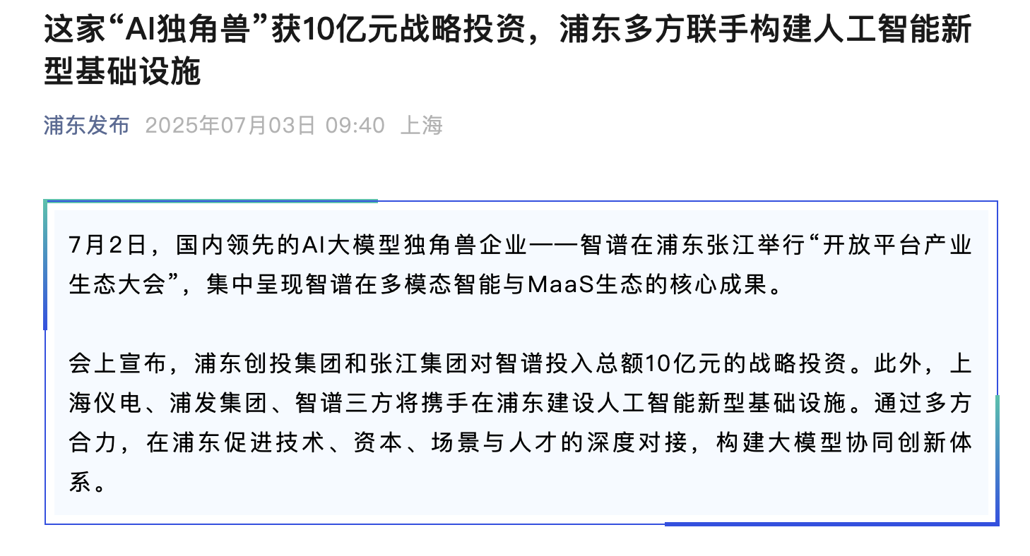 今年7月3日,据浦东发布,在智谱开放平台产业生态大会上,上海国资背景的浦东创投集团与张江集团宣布,对智谱投入总额10亿元的战略投资。