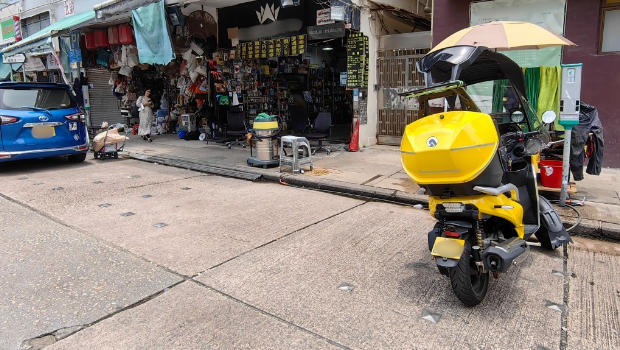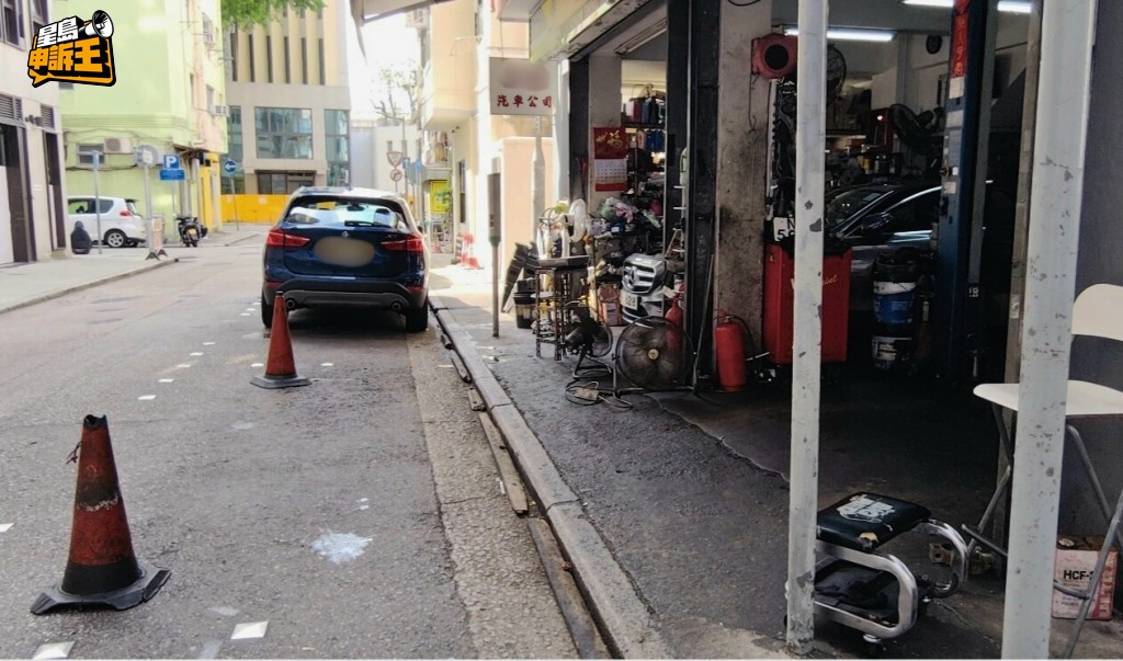 ▲九龙城龙岗道一间车房,将机动三轮车横泊在咪表位最边位置,方便客人汽车出入车房。