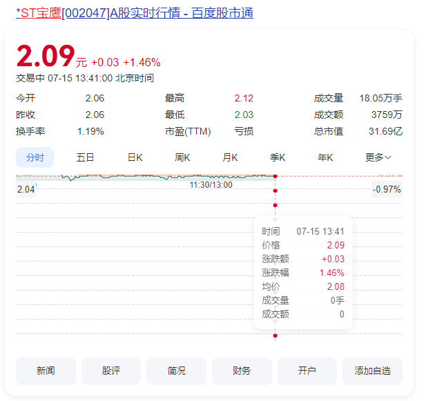 7月14日晚间,深圳市宝鹰建设控股集团股份有限公司(以下简称“*ST宝鹰”,代码:002047.SZ)公告称,为优化资源配置,拟通过广东联合产权交易中心以公开挂牌方式转让旦华复能(珠海)新能源科技有限公司(以下简称“旦华复能”)50.10%股权。7月15日,截至13:41发稿,*ST宝鹰上涨1.46%,报2.09元/股。
