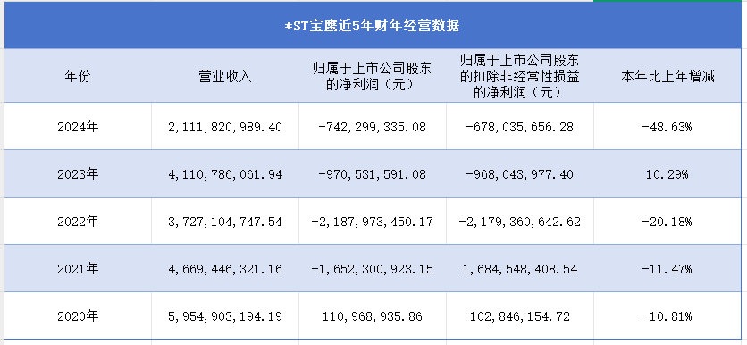 根据*ST宝鹰披露的财务数据显示,公司已连续四年陷入亏损困境。2020年至2024年期间,公司归母净利润持续为负,呈现连年亏损态势。