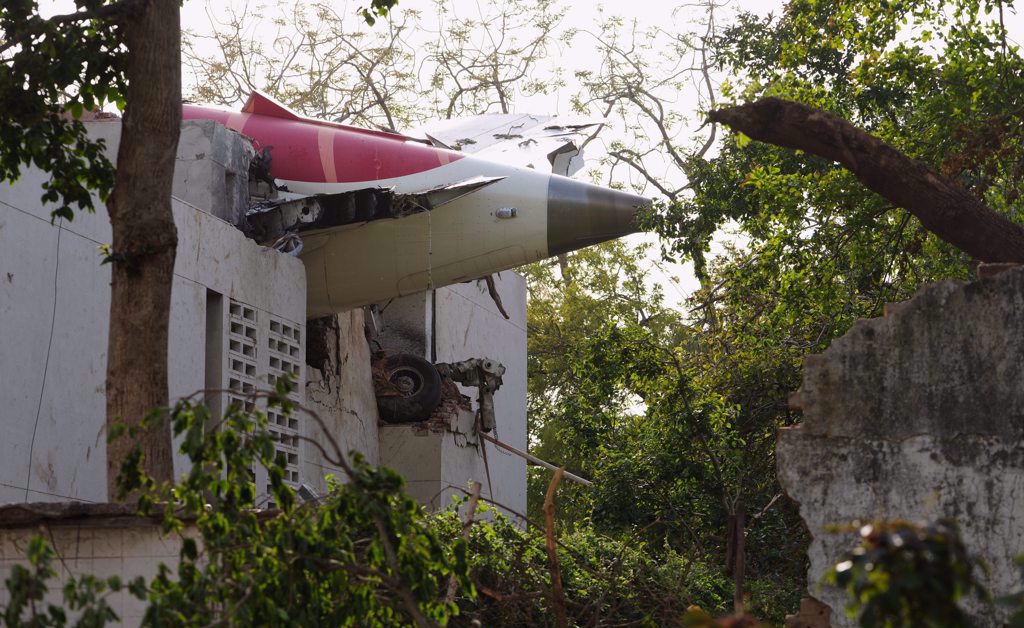 ▲印航波音787客机12日起飞不久就坠毁,机尾卡在当地社区一处学校的宿舍顶楼。(美联社)