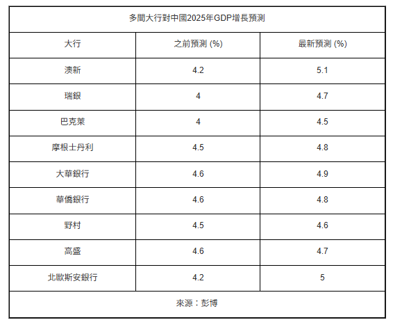 中国第二季经济增长好于市场预期后,据彭博统计至少有9间美资及国际银行上调今年中国经济增长预测,包括摩根士丹利、高盛和巴克莱等机构将中国今年GDP增速预测上调至近5%,澳新银行则将增速预测上调至5.1%。