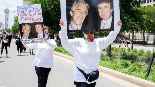 ▲洛杉矶“不要国王”示威者举起爱泼斯坦与特朗普的合照。 路透社