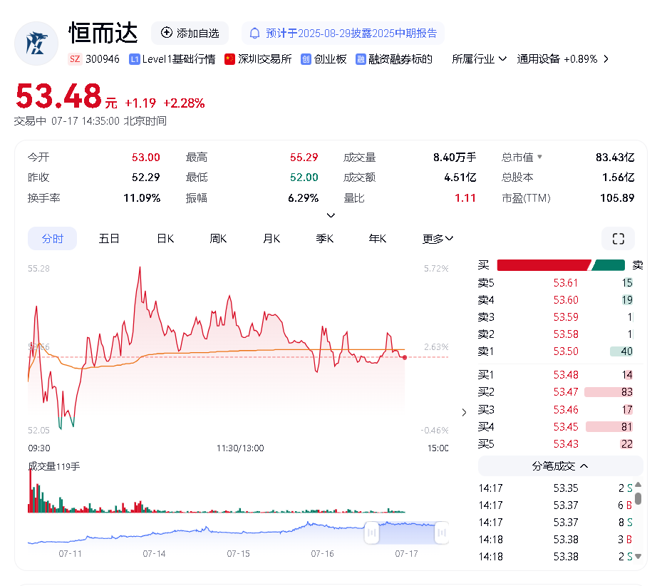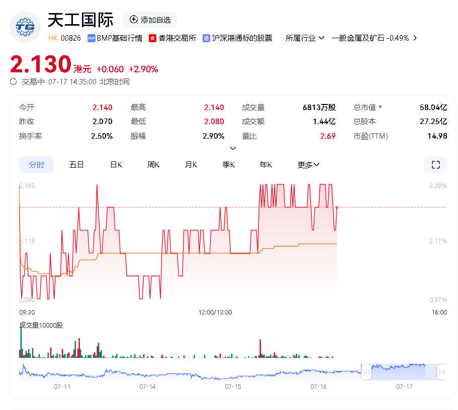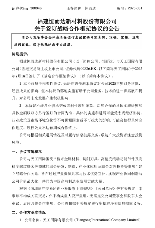 7月16日,福建恒而达新材料股份有限公司(以下简称:恒而达,代码:300946.SZ)发布与天工国际有限公司(以下简称:天工国际,代码:00826.HK)签订《战略合作框架协议》的公告。截至7月17日14时35分,恒而达报53.48元,涨幅2.28%;天工国际报2.13港元,涨幅2.90%。