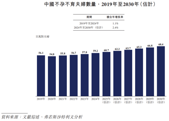 根据弗若斯特沙利文的数据,2024年中国患有不孕不育症的育龄夫妇数量为5,920万对,预计将以2.4%的复合年增长率增长至2030年的6,840万对。其中,至少20%的夫妇必须借助辅助生殖服务才能实现生育。数据显示,2024年,辅助生殖服务在拥有该等需求的不孕不育症的育龄夫妇中的渗透率为9.3%,随着辅助生殖服务的社会接受度、可及性和可负担性的不断提升,该渗透率在2030年预计将达到13.1%。