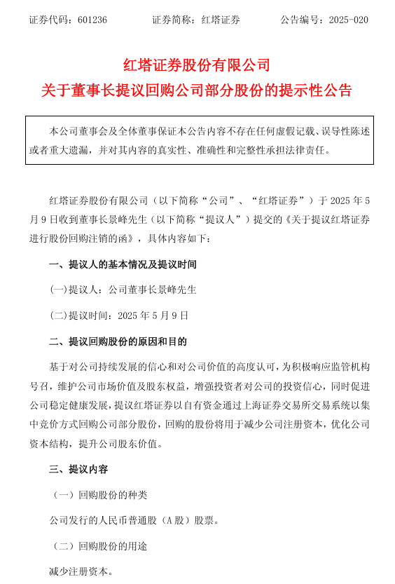 早在今年5月9日,红塔证券董事长景峰便提议以自有资金回购公司部分股份。