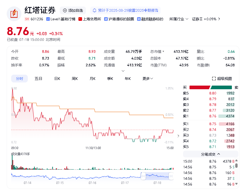 截至7月18日收市,红塔证券报8.76元,涨幅0.34%,成交量达45.79万手,成交额4.03亿元。