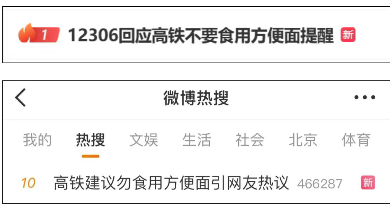 7月19日,#12306回应高铁不要食用方便面提醒#冲上热搜第一。