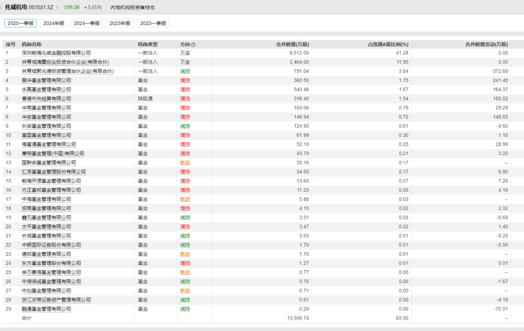 2025年一季度,有8家机构股东减持了兆威机电股份。其中,还包括兆威机电的员工持股平台共青城聚兆德投资管理合伙企业(有限合伙)(以下称“聚兆德”)。