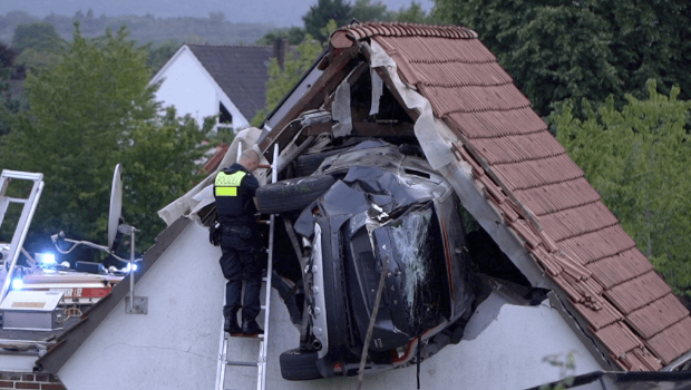德国西北部小镇博姆特(Bohmte)周日发生罕见车祸,一辆私家车失控冲出马路,撞向一名在家中花园弹床上的7岁男童后,再“弹飞”至邻近谷仓的屋顶,造成司机及其妻子重伤,男童亦伤势严重。