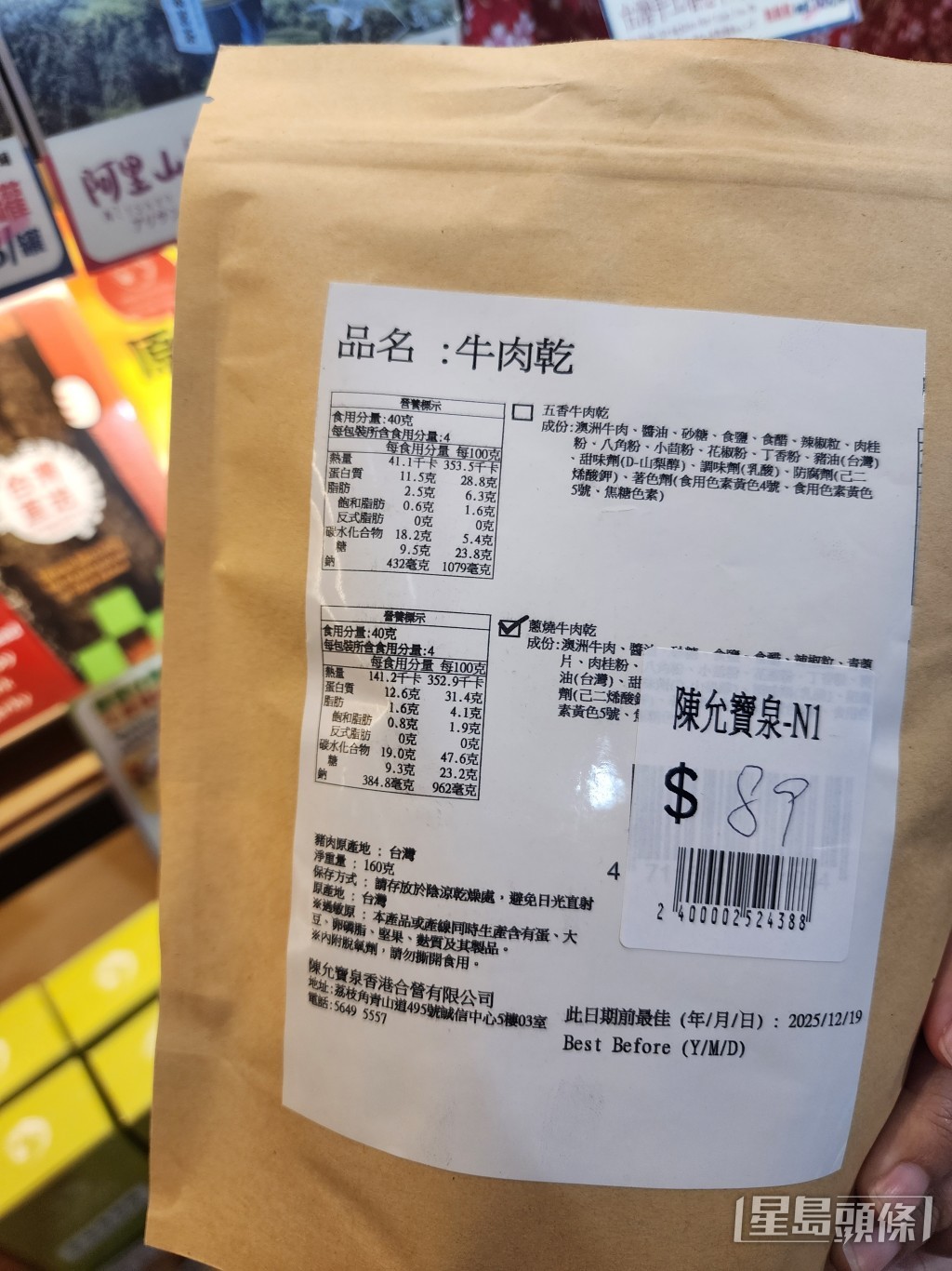 ▲本月16日品牌于崇光销售的部分产品,贴有台湾“陈允宝泉”的国际条形码,并写有“陈允宝泉香港合营有限公司。”