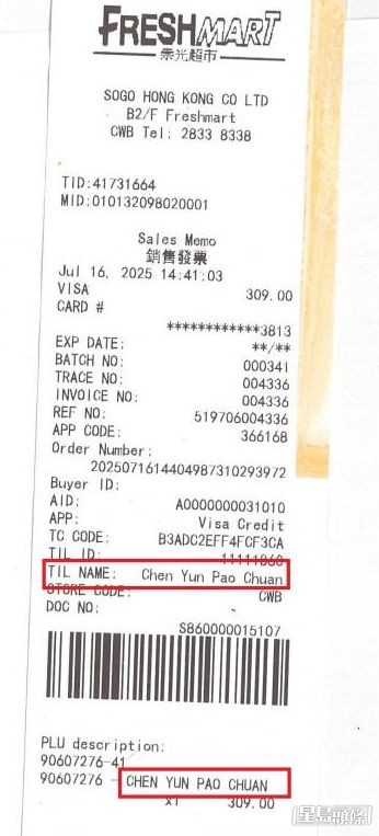 ▲记者在崇光销售点取得的单据,写有“陈允宝泉”的英文名。