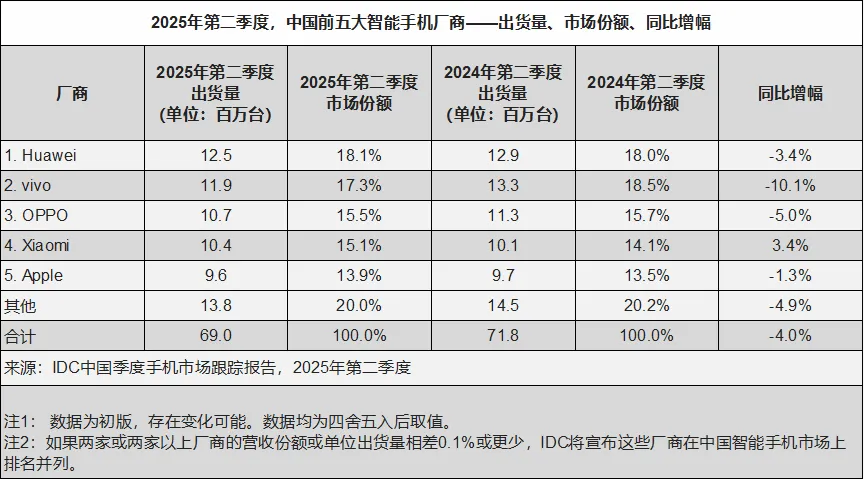 国际数据公司(IDC)最新手机季度跟踪报告显示,2025年第二季度,中国智能手机市场出货量结束了连续六个季度的增长,出货量6,896万部,同比下降4.0%。2025年上半年中国智能手机市场出货1.4亿台,同比下降0.6%,与去年同期基本持平。