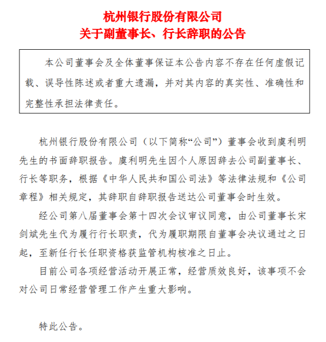 值得注意的是,4月2日,杭州银行公告称,董事会收到虞利明的书面辞职报告。