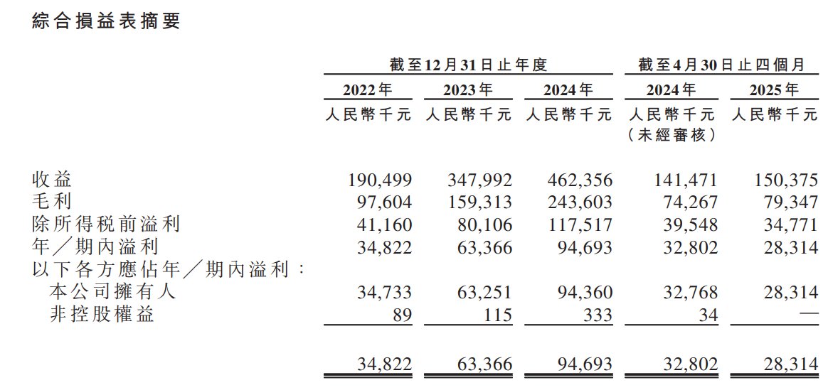 财务方面,于2022年度、2023年度、2024年度、2025年度截至4月30日止四个月,聚智科技分别录得收益约为1.90亿元、3.48亿元、4.62亿元、1.50亿元人民币,期内利润分别约为3482.2万元、6336.6万元、9469.3万元、2831.4万元人民币。